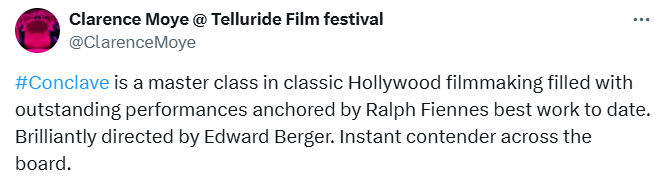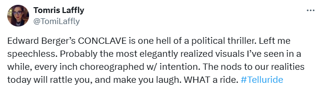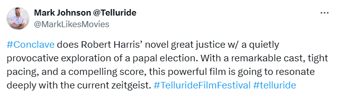 The 51st Telluride Film Festival kicked off last night. One of the more anticipated movies to world premiere there is Edward Berger’s “Conclave,” which screened in the early evening to very positive reactions.