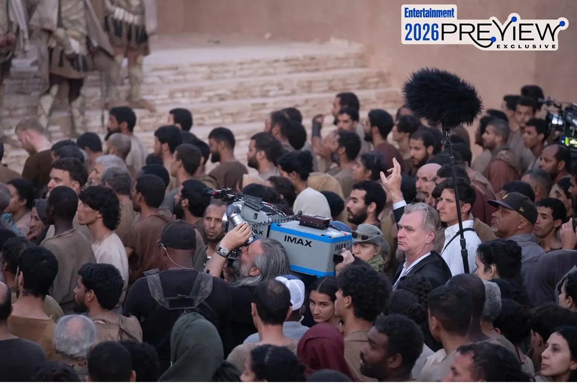 Additional photos feature Anne Hathaway as Penelope and Tom Holland as Telemachus, Odysseus’s wife and son; Robert Pattinson as Antinous, one of Penelope’s suitors; and director Christopher Nolan himself on set, seen with one of his signature IMAX cameras.