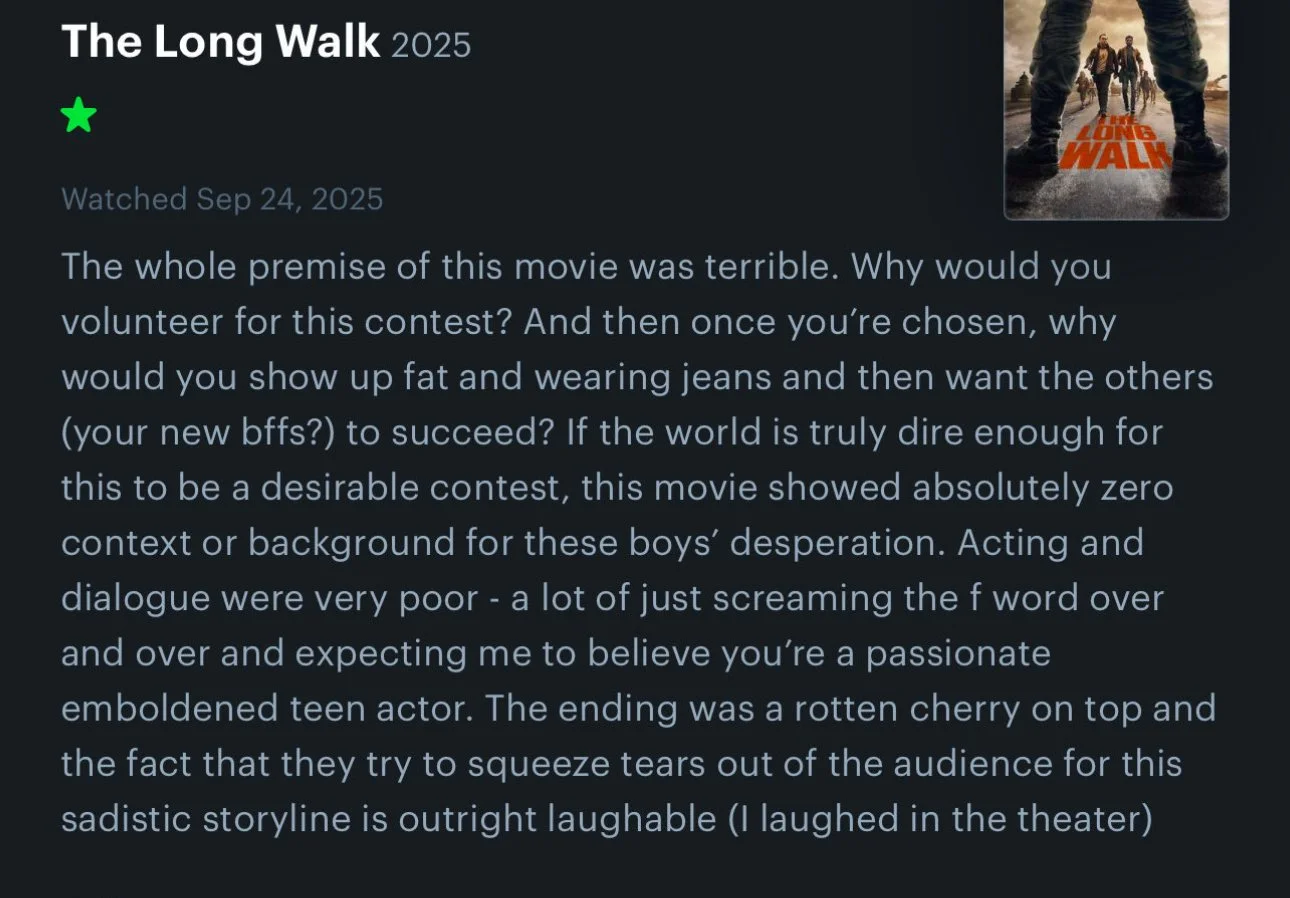 Yet a review from Letterboxd, of all places, has been making the rounds — largely because of how precisely dead-on it is in calling out the film’s more ludicrous elements. You can read it below this piece. They’re criticizing the internal logic and world-building of The Long Walk, not just the execution.