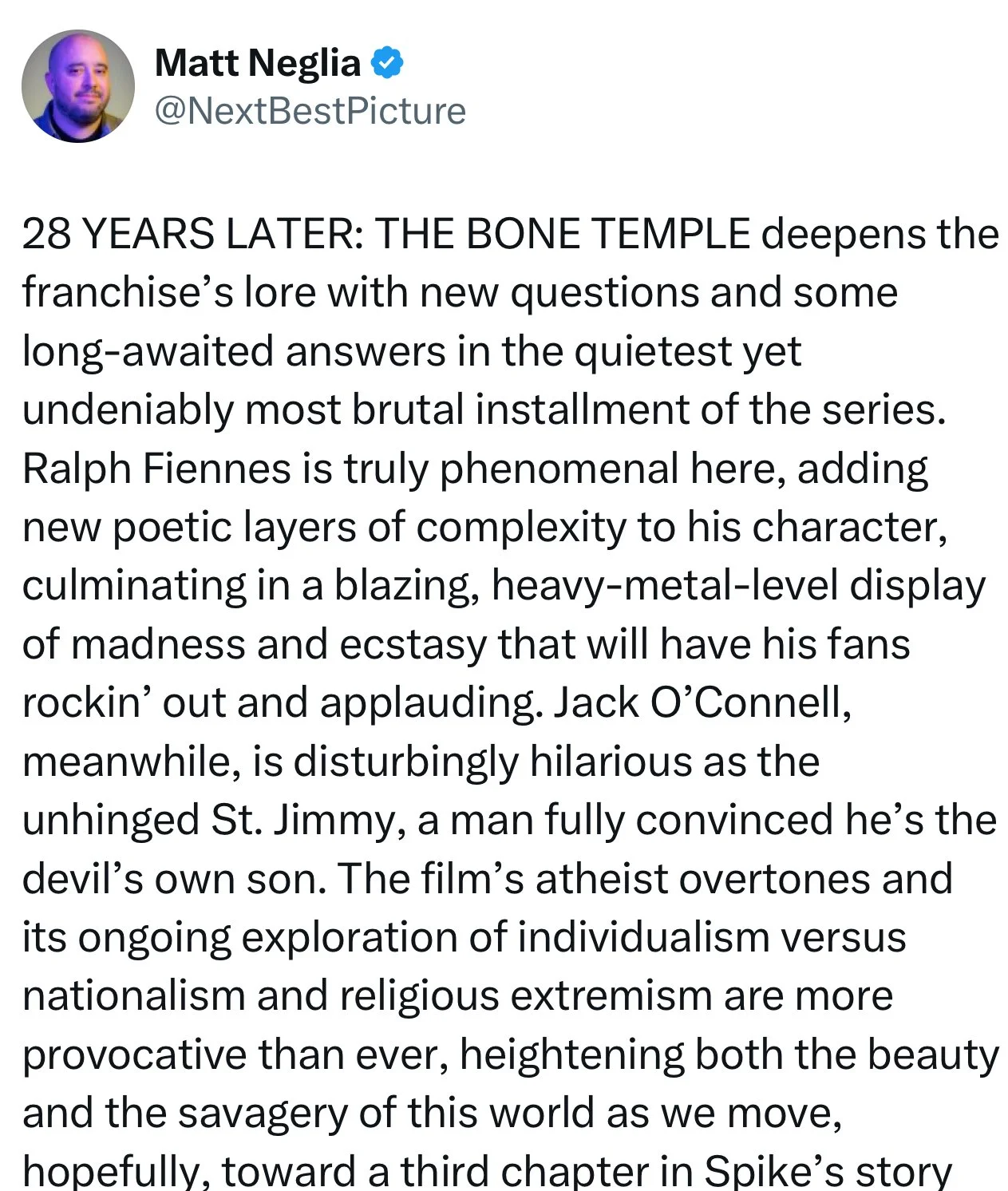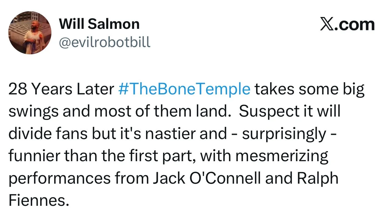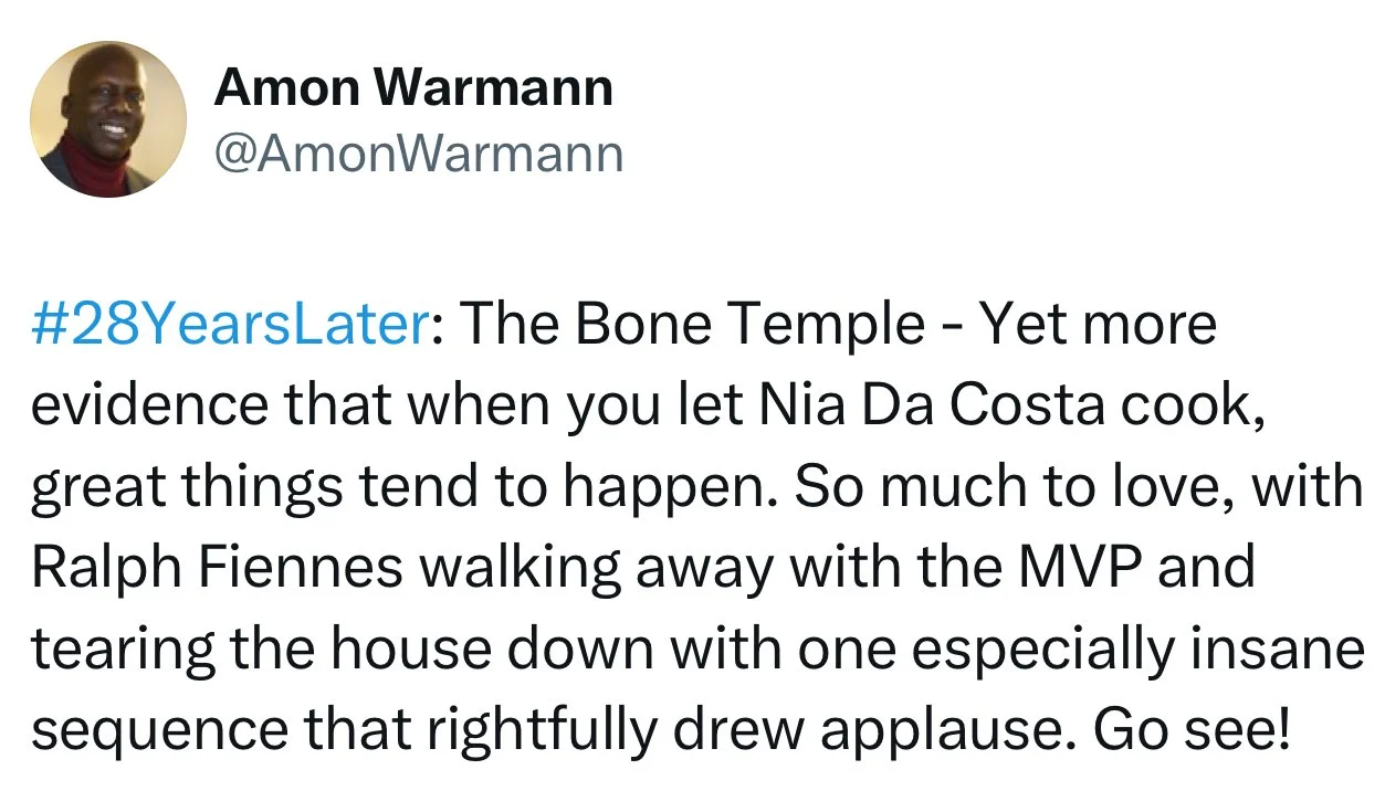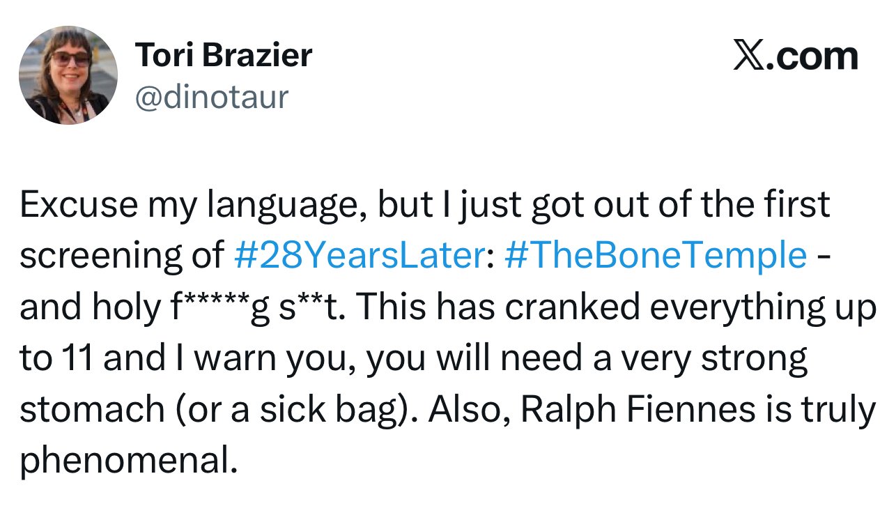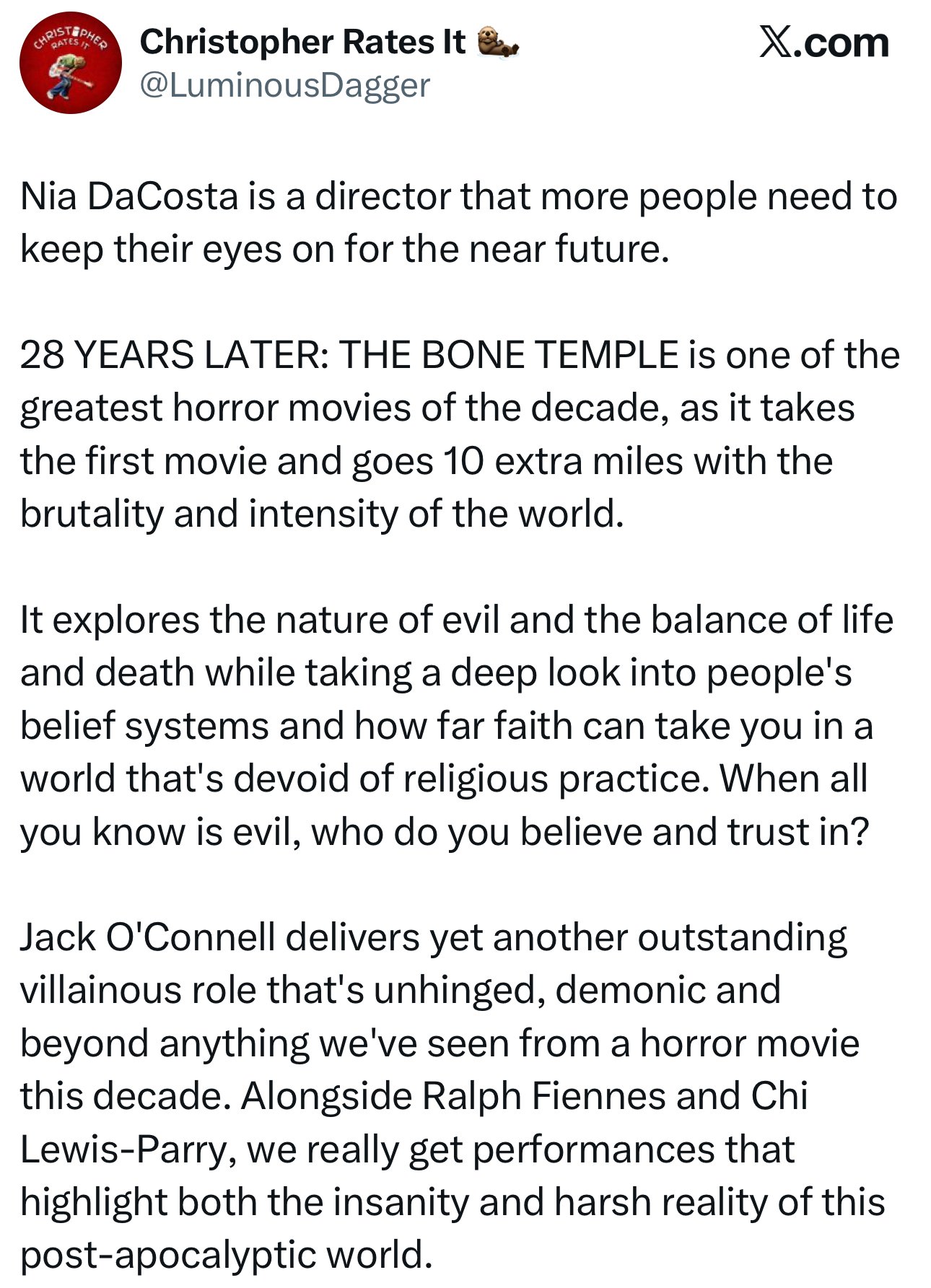 Here’s a surprise. Sony Pictures not only decided to surprise screen Nia DaCosta’s “28 Years Later: The Bone Temple”in NYC, almost six weeks before its release, but they’ve also allowed social media reactions to roam freely online.