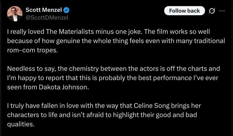 As is often the case with early social media reactions, it’s wise to take them with a grain of salt—but so far, things are looking positive for Celine Song’s sophomore feature, “Materialists,” which has begun press screenings in New York and Los Angeles.
