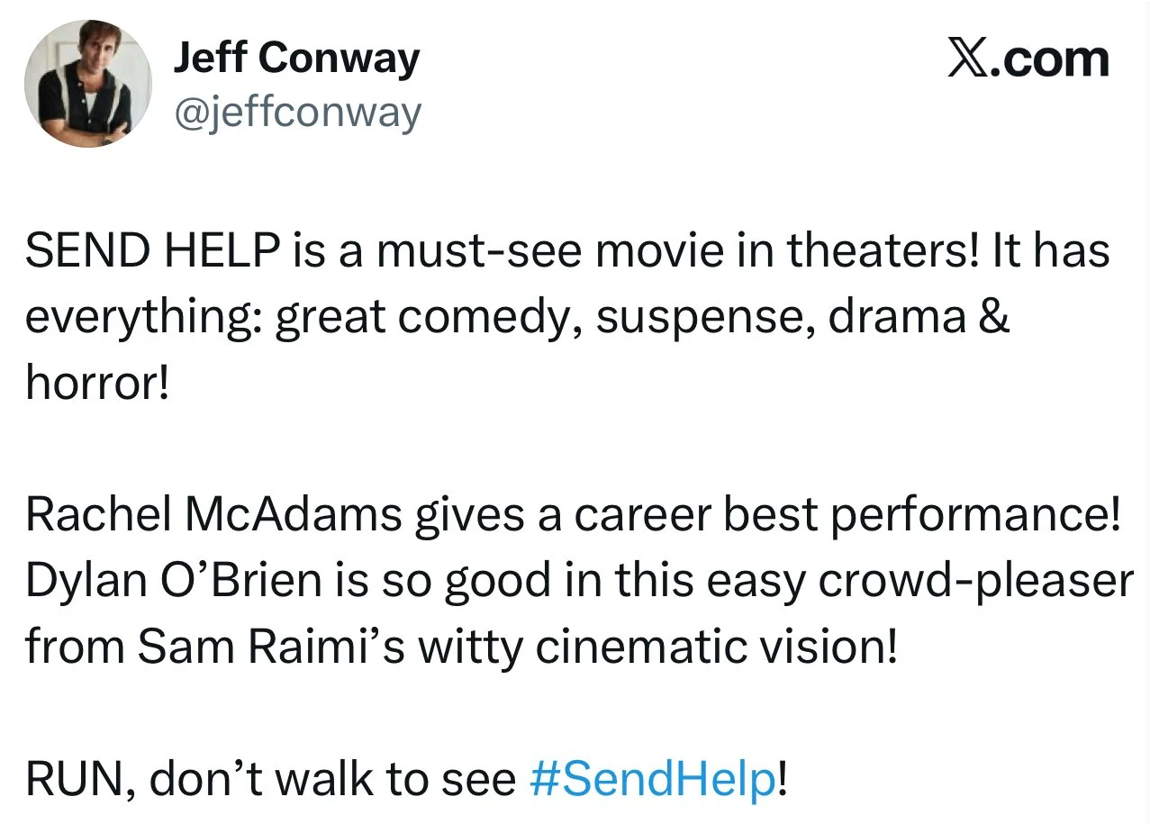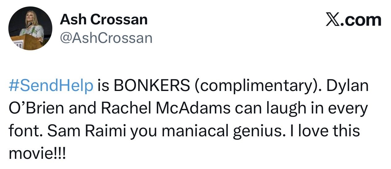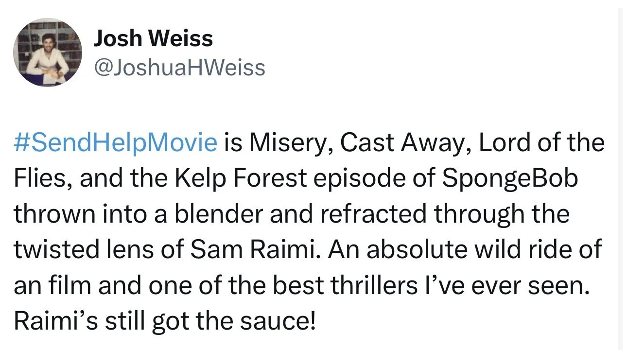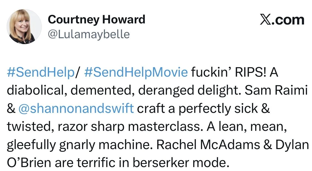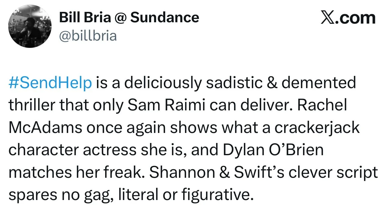 I’ll be seeing “Send Help” tomorrow morning. The review embargo breaks on Monday, and the film hits theaters on Friday, January 30.