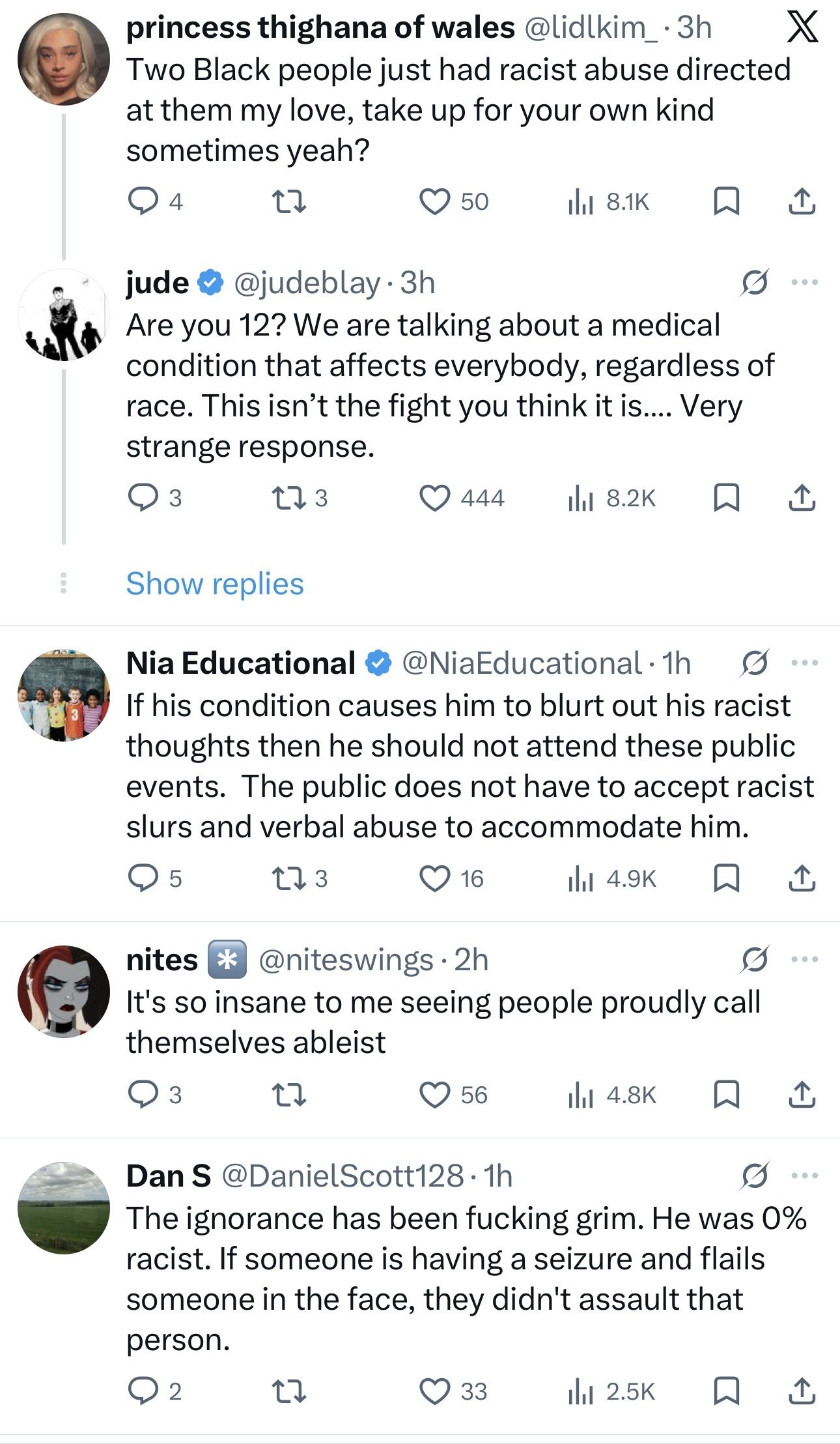 Now, to the honest question many people quietly asked afterward: Does Tourette’s actually force someone to have racist thoughts, or does it stop them from hiding racist thoughts? I don’t know enough about the disease, and it’s obviously uncontrollable, but many on social media are absolutely pissed off about what happened.
