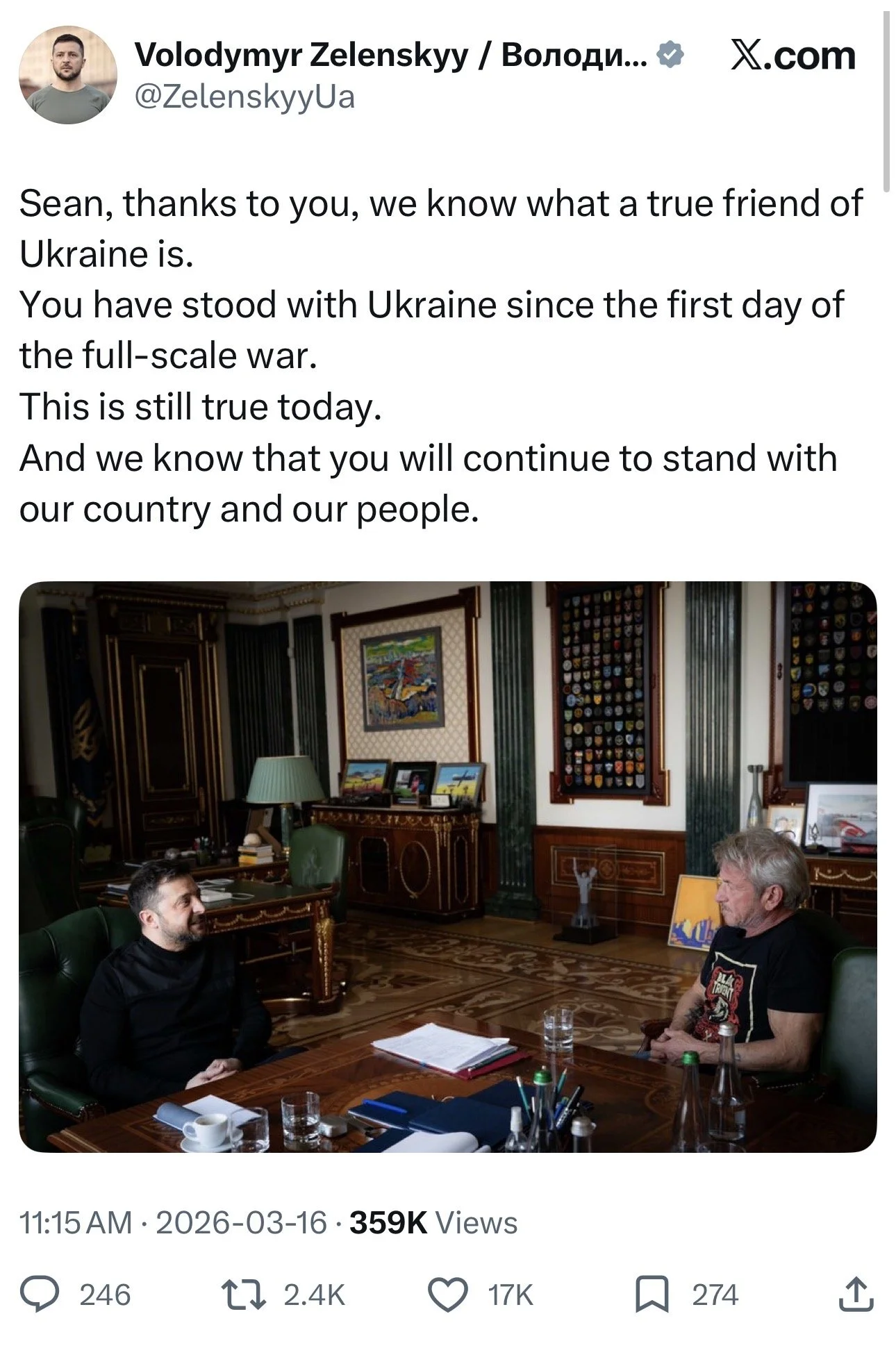 The Ukrainian leader posted a photo of them together on X, thanking the actor. Zelenskyy wrote, “Sean, thanks to you, we know what a true friend of Ukraine is. You have stood with Ukraine since the first day of the full-scale war. This is still true today. And we know that you will continue to stand with our country and our people.”