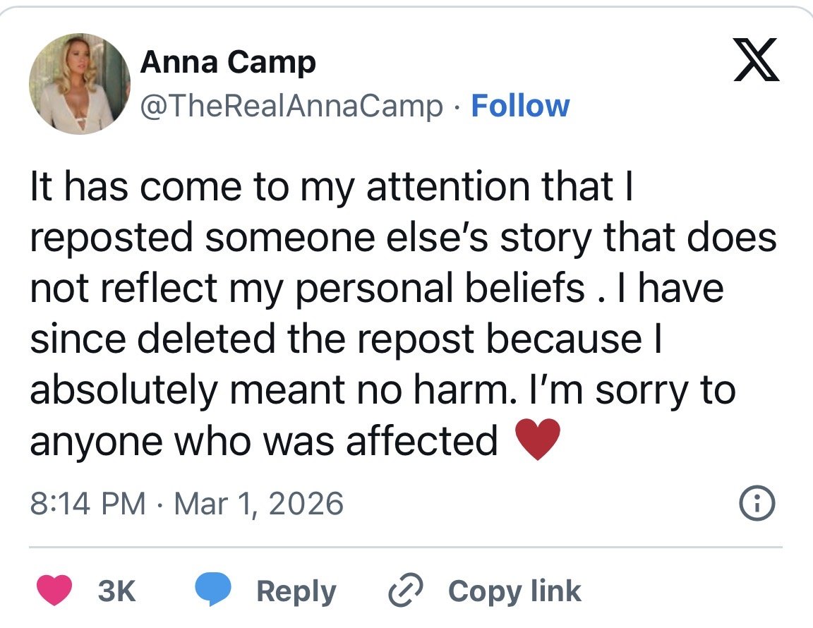 On Monday, Camp deleted her post and wrote on X: “It has come to my attention that I reposted someone else’s story that does not reflect my personal beliefs. I have since deleted the repost because I absolutely meant no harm. I’m sorry to anyone who was affected.”