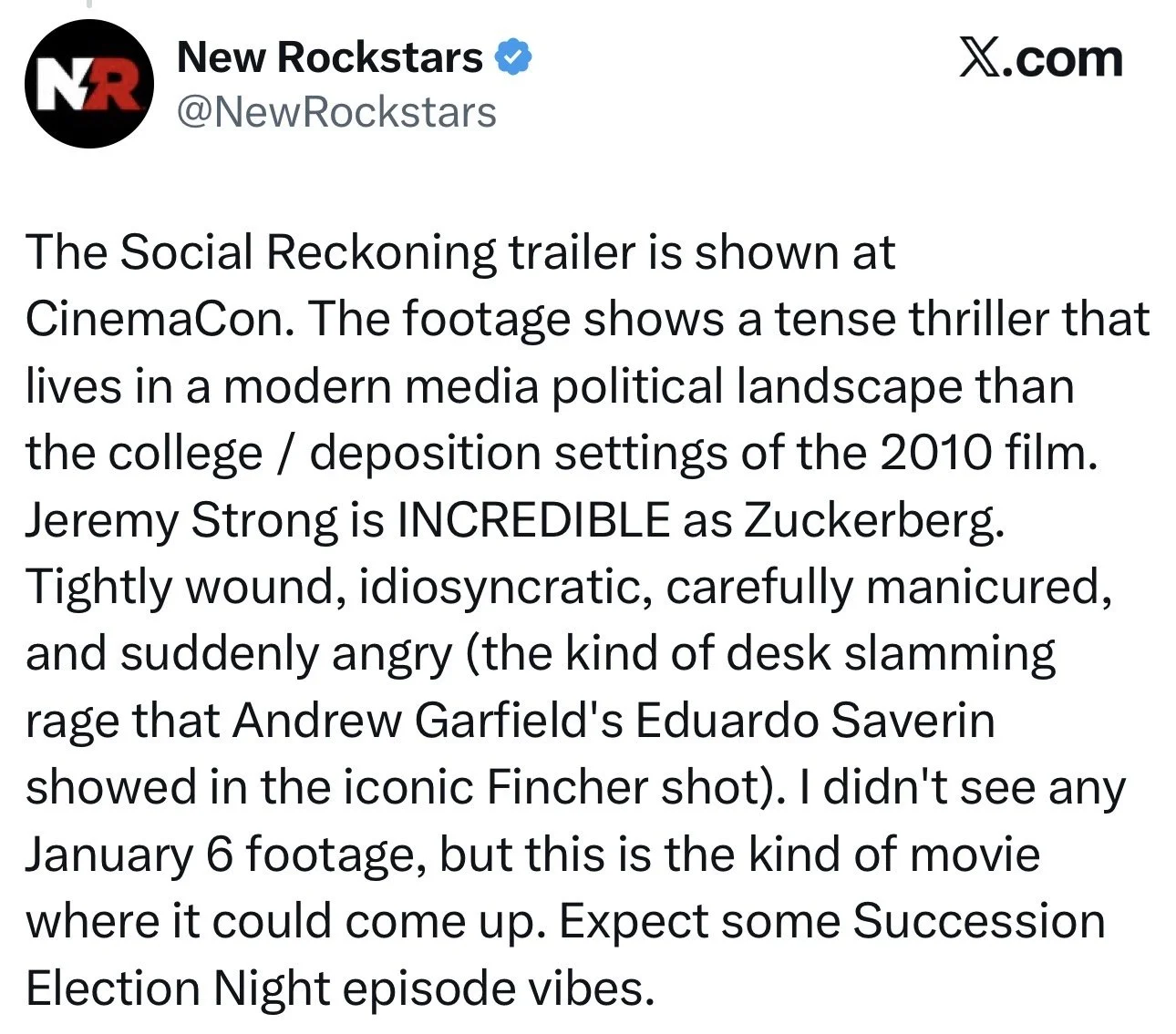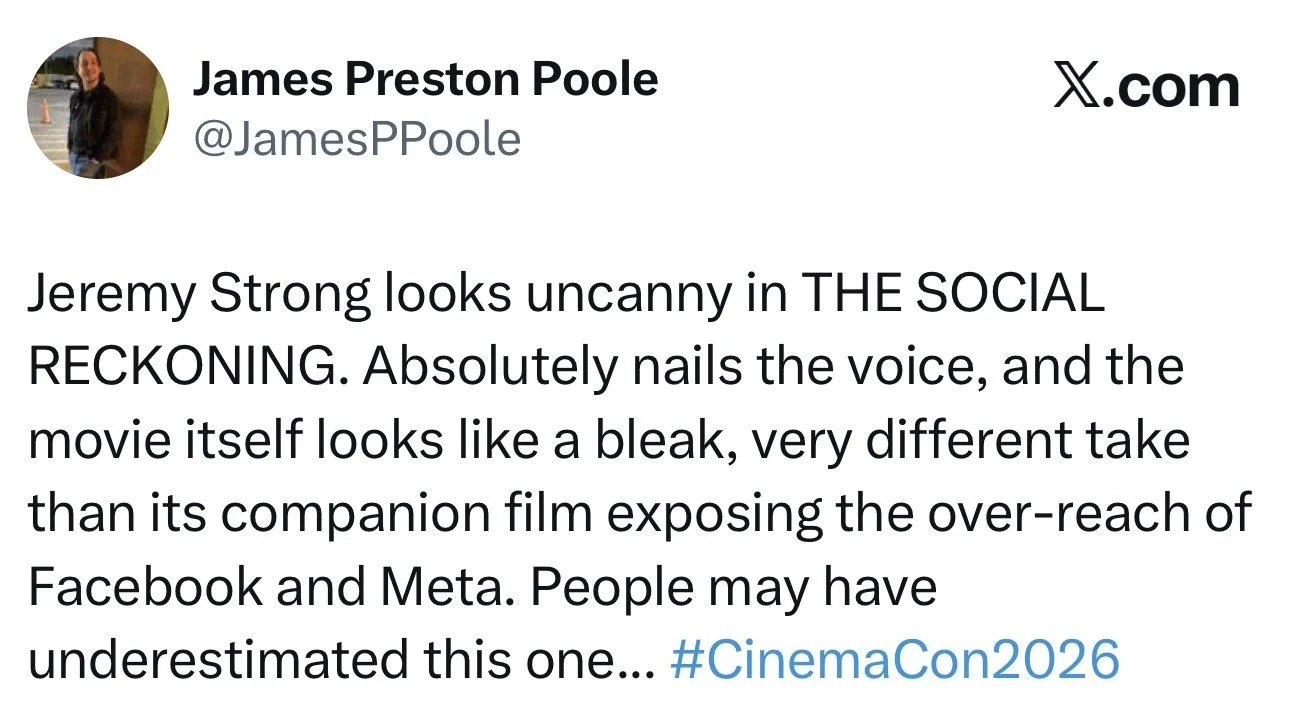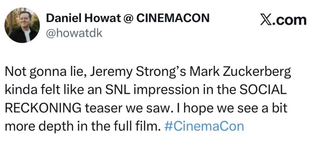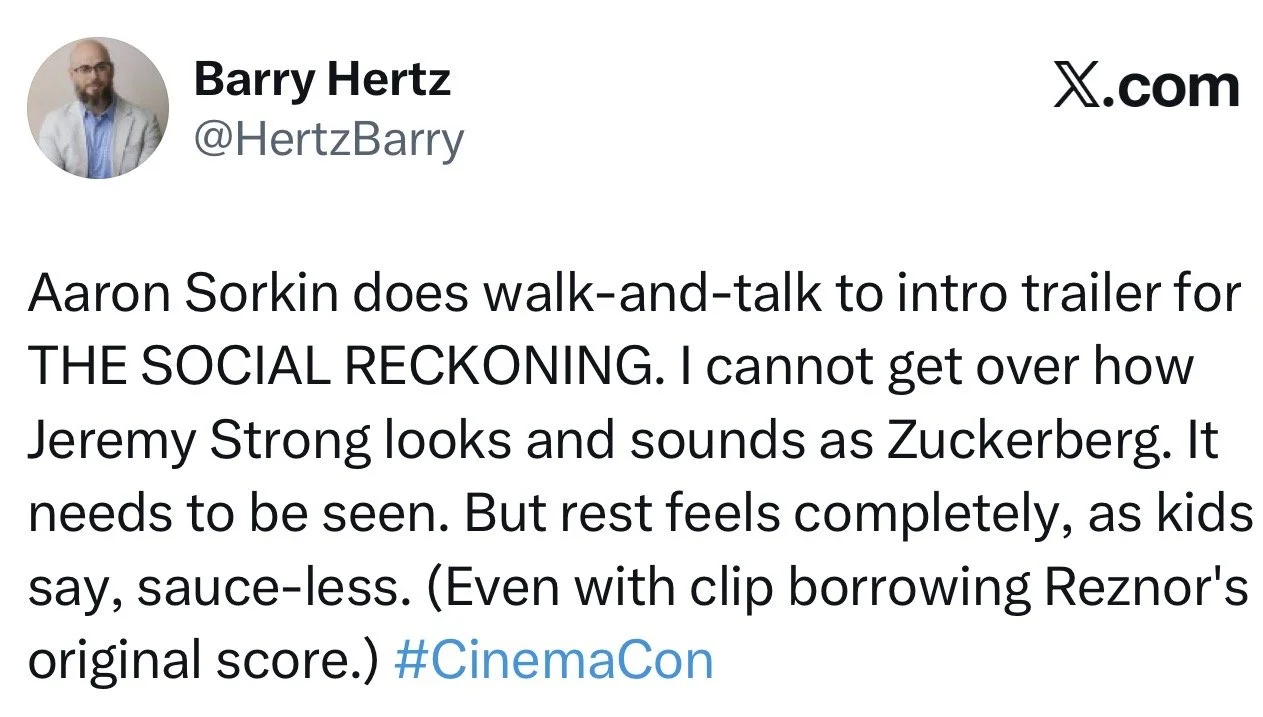 Last night, at CinemaCon, Sorkin hit the stage to debut the trailer for “The Social Reckoning,” the companion piece to 2010’s “The Social Network.” Here’s a transcript of his intro: