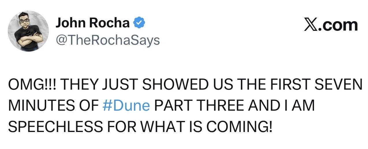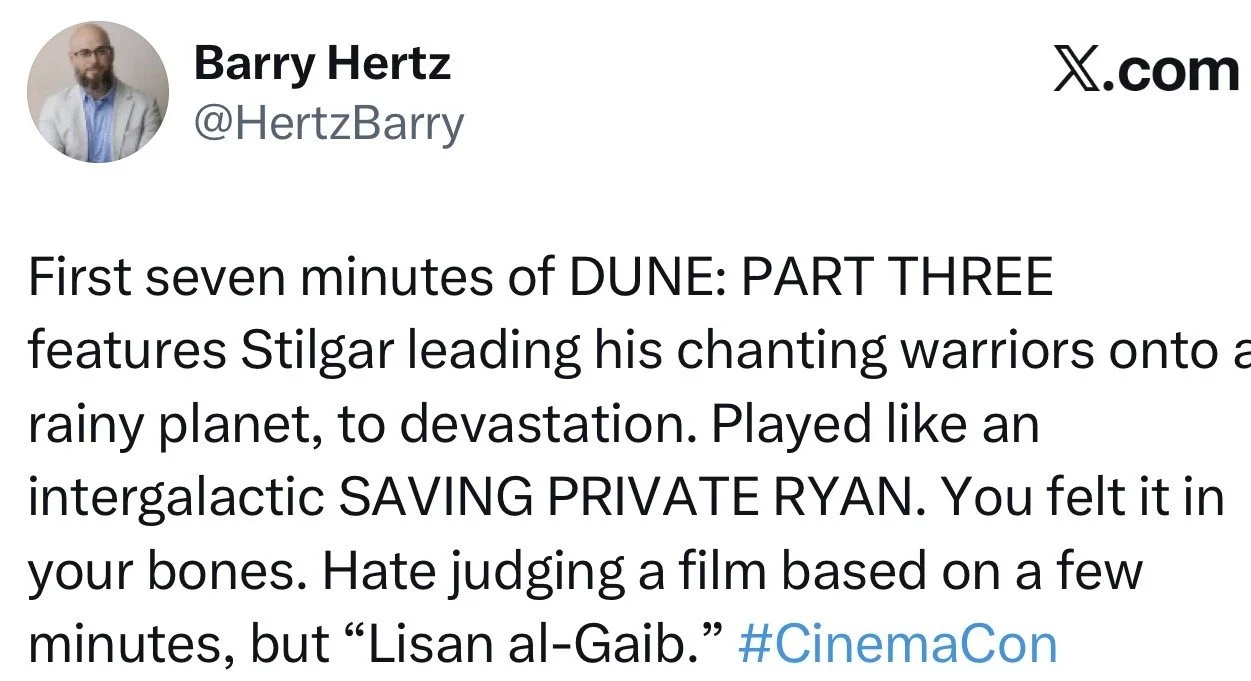 Warner Bros.’ CinemaCon panel concluded with what seems to unanimously be the night’s biggest highlight: a screening of the first seven minutes of Denis Villeneuve’s “Dune: Part Three.”