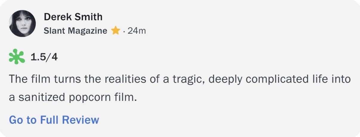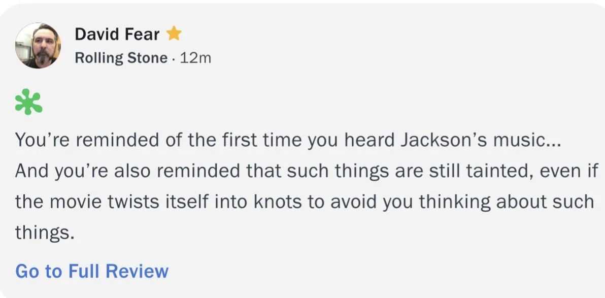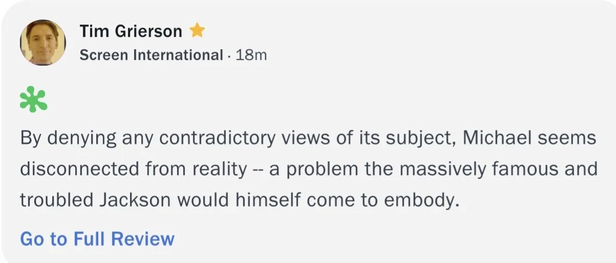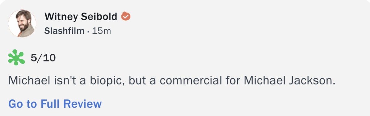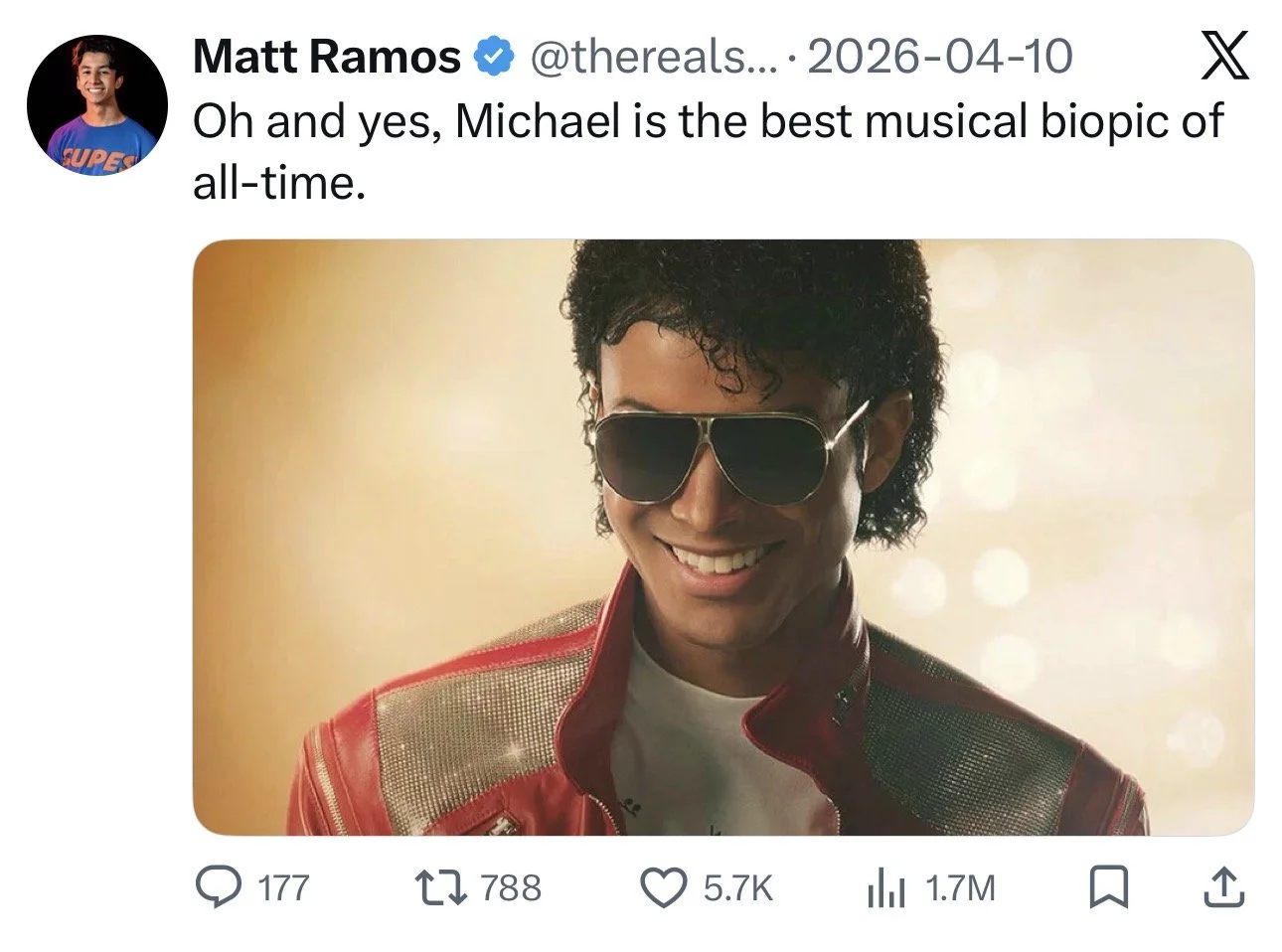 Side note: we should never forget that viral early reaction of “Michael,” where “critic” Matt Ramos called the film “the greatest musical biopic of all-time.” The kind of over-the-top endorsement that exemplifies the current influencer-driven era of big studio psyops.