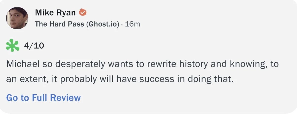 Side note: we should never forget the viral early reaction from “Michael,” where critic Matt Ramos called the film “the greatest musical biopic of all-time.” The kind of over-the-top endorsement often cited in discussions about influencer-driven marketing cycles and what I like to refer to as “big studio psyops.”