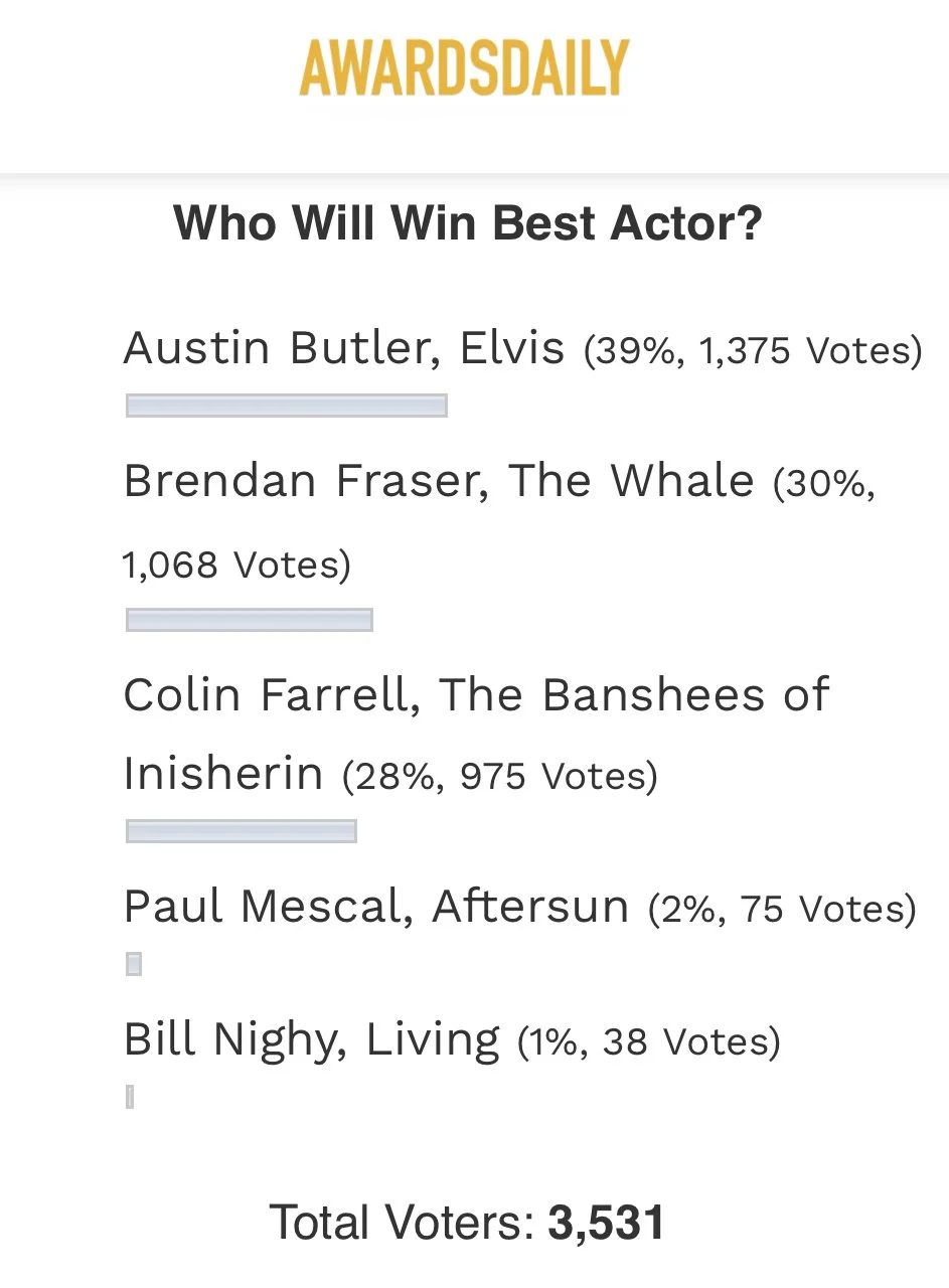 Also, an Awards Daily poll of readers has amassed close to 3000 participants and Butler is currently in the lead.